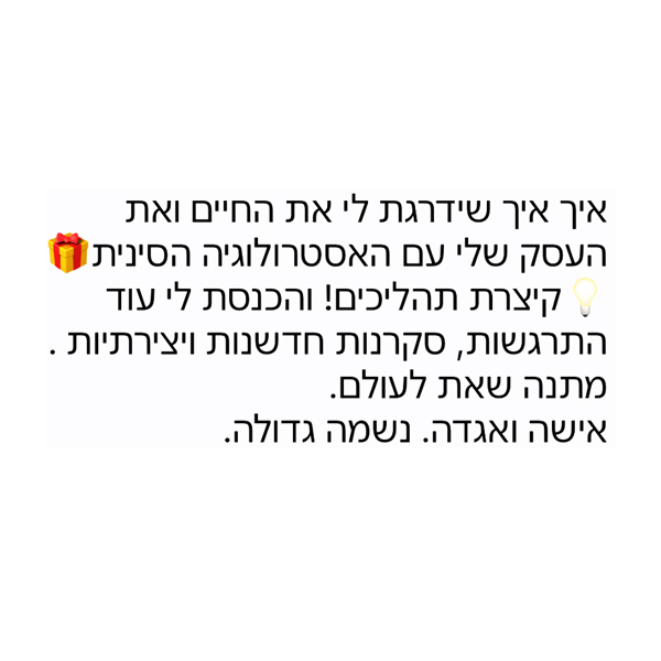 קורס אסטרולוגיה סינית הוא קורס מרתק שיוצר אצל כל אחד פריצת דרך, ואם לא במהלך הקורס אז אחרי. תקבלו ידע שיאפשר לכם להבין כל קושי ולדעת איך להתמודד איתו בצורה הטובה ביותר. הידע הזה יוצר התנהלות נינוחה יותר ומאושרת יותר לחיים טובים ובריאים